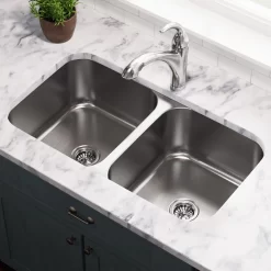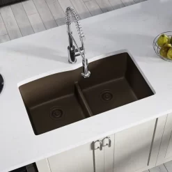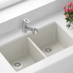 802 Double Equal Bowl Quartz Kitchen Sink, White, Basket Strainers