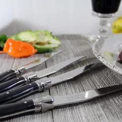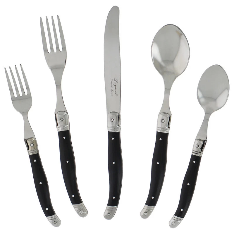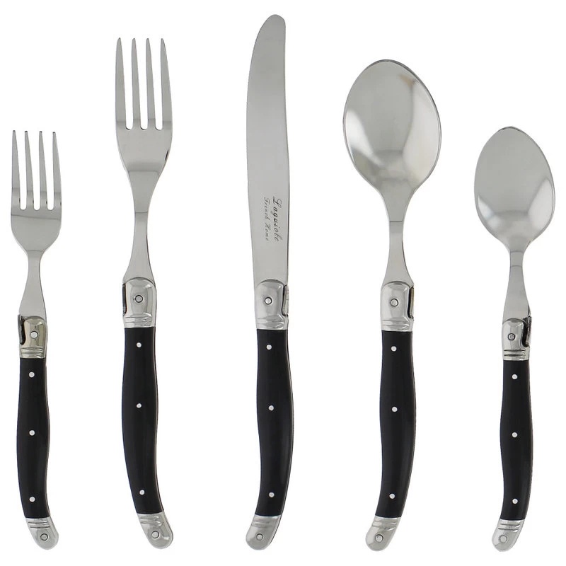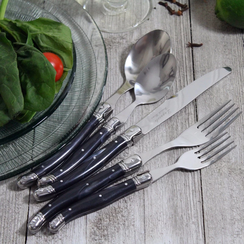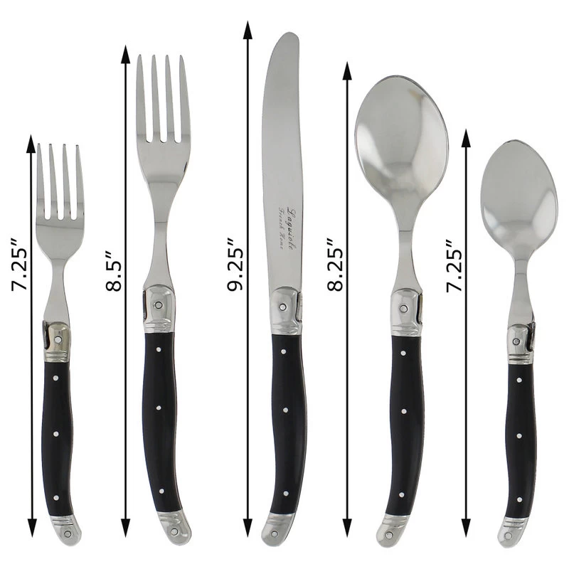 French Home’s traditional and elegant Laguiole design with the iconic three rivit curved handle and Bee emblem is comfortable to hold and perfectly balanced. Ideal for casual or formal dining, the fully tanged 20 piece stainless steel set has faux marble handles and is dishwasher safe. Laguiole is a town in France where this style of cutlery originated. Set includes four 9.25″ dinner knives, four8.5″ dinner forks, four 8.25″ soup spoons, four 7.25″ salad forks and four 7.25″ dessert spoons.