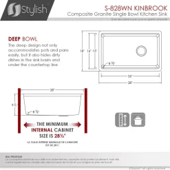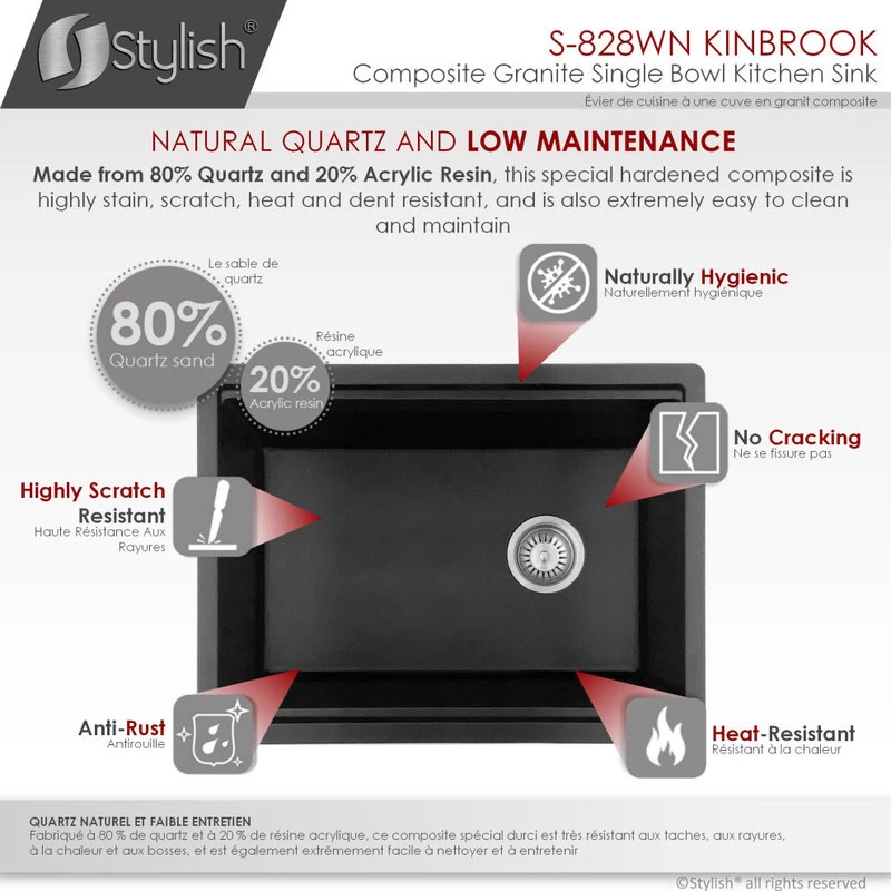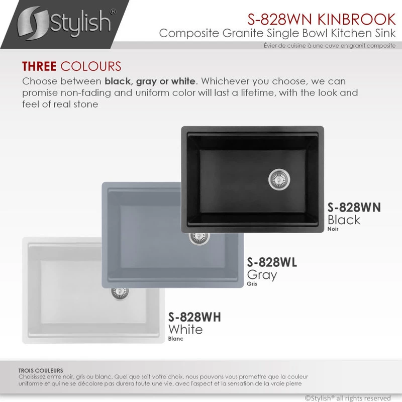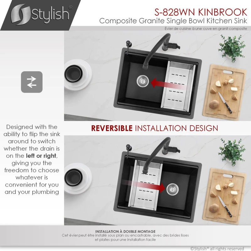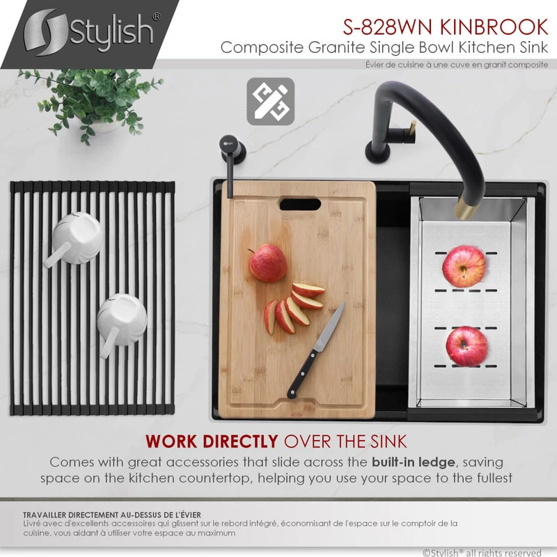 A clever and modern design are part of this stunning composite granite workstation kitchen sink. Rock your kitchen experience with the included standard strainer, roll-up drying rack, stainless steel colander and perfect fit bamboo cutting board. This amazing 28-inch single bowl dual mount composite granite kitchen sink is made with 80% natural quartz which makes this sink exceptionally durable and low-maintenance, with a stone-like material that is much lighter than solid granite, but still great for the challenge of handling your everyday demands. If that wasn’t enough, it has been cleverly designed with a ledge that allows the kitchen sink accessories to perfectly fit on top of the kitchen sink saving space on the kitchen countertop. This single bowl granite kitchen sink is highly resistant to dirt and grime, very easy to clean and maintain. It is designed to be dual mount. It can be Installed over the countertop or as an undermount sink for a more seamless appearance. A deep 9.5-inch bowl gives plenty of room for larger pots and pans. The thick granite material eliminates vibration and noise when the sink is in use, making it exceptionally quiet. The drain has been placed to the side centre with a gently slopped bottom to allow for easy drainage and prevent standing water in the single bowl. This composite granite kitchen sink has also been designed with a reversible installation, the sink can be flipped around to choose whether the drain is on the left or right, giving you the freedom to choose what is convenient for you and the plumbing in your kitchen. Available in three beautiful colors, Black, Gray and White, this composite granite kitchen sink will not fade, the color penetrates through the entire surface allowing for the color to last a lifetime. Also Included with this single bowl composite granite kitchen sink are installation instructions and mounting hardware for your convenience. Clean lines and simple shapes define this stunning workstation kitchen sink. Modernize your kitchen and create an uninterrupted workspace with this amazing composite granite workstation kitchen sink.
