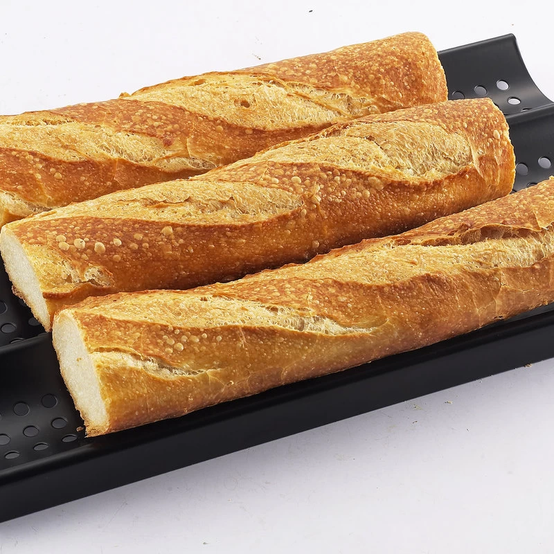 The ZenUrban 870002 nonstick 3-loaf perforated baguette French bread pan forms those delightful long slender loaves of bread that we all love. The holes in this pan allow complete air circulation around the bread loaves. Made of commercial-grade carbon steel for even heat retention, and coated with a dishwasher nonstick surface for easy cleaning. The pan measures 16 x 9 x 1-inch (41 x 23 x 3 cm) and has three troughs so you make three loaves in one pan. The pan can easily be placed on the shelf of your oven or directly on a baking stone to get the benefits of stone baking. These pans are designed to hold 1 1/2-pounds of bread dough. Non-metal utensils should be used to prevent damage to the finish.