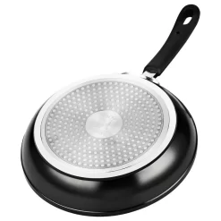 What’s in a box, frying pan 8-inch diameter by 1.7-inch Height, frying pan 10-inch diameter by 2-inch height, frying pan 12-inch diameter by 2.2-inch Height. Nonstick coating is premier grade quality, cadmium and lead free, durable double coating system. Cookware use thick gauge aluminum material which provide super heat conductive without any hot-spot in bottom, bottom is specially designed for induction stove/range, handle is soft feeling and comfortable to handle and stay cool during cooking, handle attached to pan with 2 strong rivet. Do not use metal utensil, it will scratch nonstick coating, over-heating will damage nonstick coating, put hot pan in cold water will reduce nonstick coating life span. See detail in use and care.