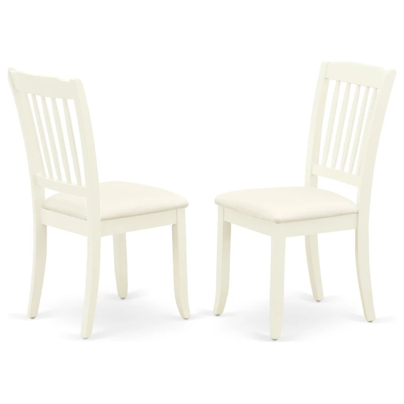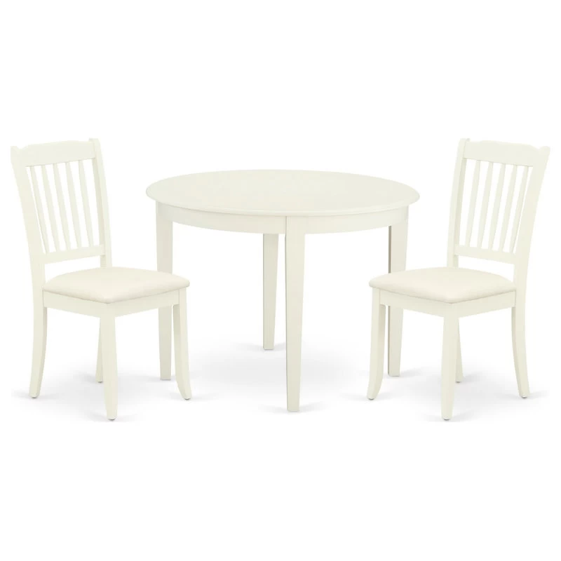 BODA3-WHI-C 3Pc Dinette Set Includes a Rounded Kitchen Table and Two Vertical Slatted Microfiber Seat Dining Chairs, White FinishBring the family charm in the dining area with this BODA3-WHI-C dinette set which highlights the natural elegance of Asian wood. A cozy and luxurious white color offers any dining-room a relaxing and friendly feel with the small kitchen table. With a soft rounded bevel at the edge of the table top, this well-designed and comfortable dinette table may be used for hours at a time. This small dining table requires a very little space and it d be a great choice if you are struggling with space in your dining area. Made up of rubber wood, the table is stable and offers a sturdy finish. This eye-catching Danbury dining room chair offers a modern and sophisticated look. The Kitchen dining chairs come with a microfiber upholstery seat to fit personal preference and perfect design. This Stylish dining chair features curved front legs. Elegant kitchen chairs feature 7 vertical slats to give any dining area a touch of class and sophistication. Finished in luxurious Linen White Color. The standard shape, size and design makes the dining area significantly attractive. This budget friendly, durable and comfortable dining set can be good choice if you are looking for a great dining time experience with your family or friends.Table Specifications:Material: Asian HardwoodColor: WhiteDimensions: Length 42; Width 42; Height 30Weight Capacity: 300 lbsChair Specifications:Frame Material: Asian HardwoodFabric: Microfiber FabricCushion Material: FoamFabric Color: WhiteChair Finish: Linen WhiteDimensions: Length 21; Width 18; Height 38Weight Capacity: 300 lbsIncludes:1 x Round Table2 x Dining ChairN. B. : Hardware package and instruction manual is located in/under the seat.