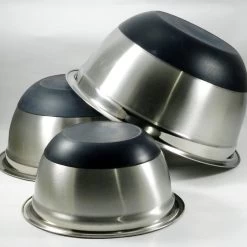 Set of designer bowls – 3 bowls , great for baking, mixing and many multiple uses in the Kitchen. Three bowls come in 5 qt, 3 qt and 1.5 qt. Non-Skid Bottoms keeps bowls stable and prevents sliding. Flared rim makes bowls easy to hold. Premium quality stainless steel