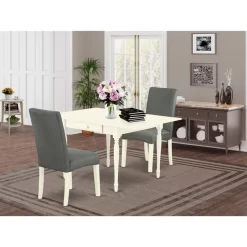 East West Furniture MZDR3-LWH-07 3Pc Dining Table Set Contains a Dining Table and 2 Upholstered Dining Chairs with Gray Color Linen Fabric, Drop Leaf Table with Full Back Chairs, Linen White Finish