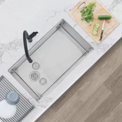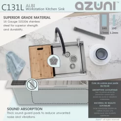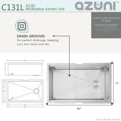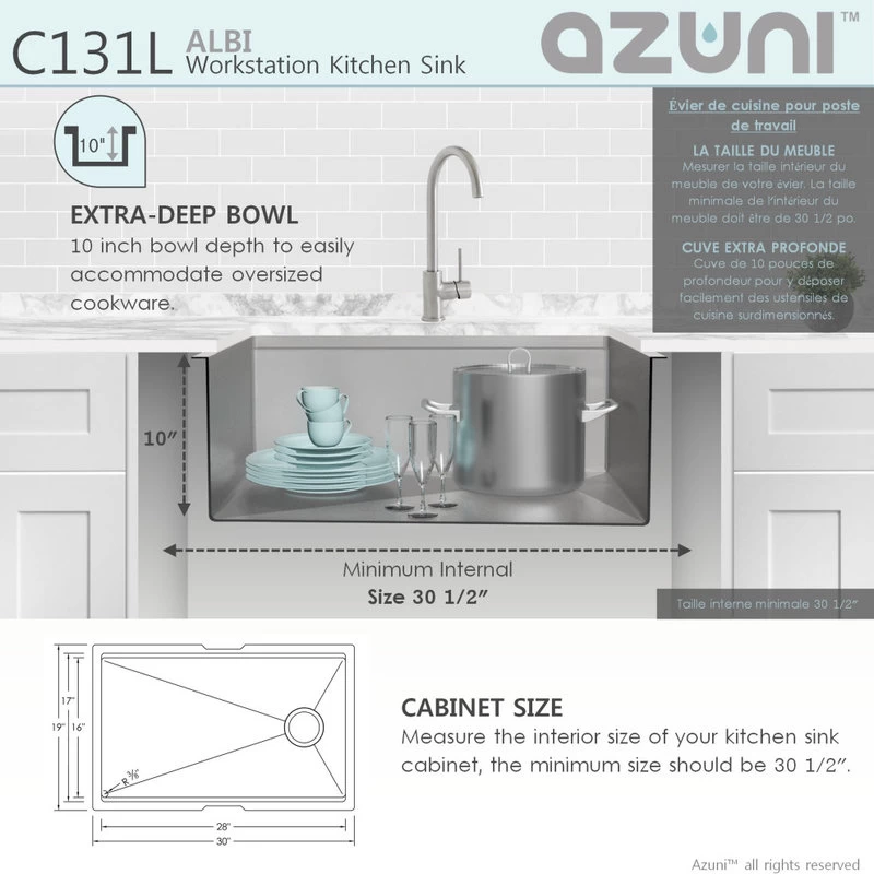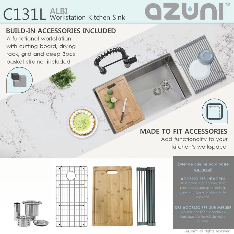Create a sophisticated kitchen look with our AZUNI Sinks. Featuring this 30″ x 19″ x 10” Undermount Kitchen Sink. This workstation kitchen sink combines the best of both world: a bold stainless-steel single bowl sink with a functional workstation: built-in accessories that slide on the integrated tracks in the sink. This stainless-steel kitchen sink includes one luxury basket strainer, one drying rack, one bamboo cutting board and one bottom grid made of 100% stainless steel which will really help to protect your sink from dents or scratches. Handcrafted using premium 304 stainless steel with 16 gauge and 18/10 chrome/nickel content and featuring a refined brushed finished.