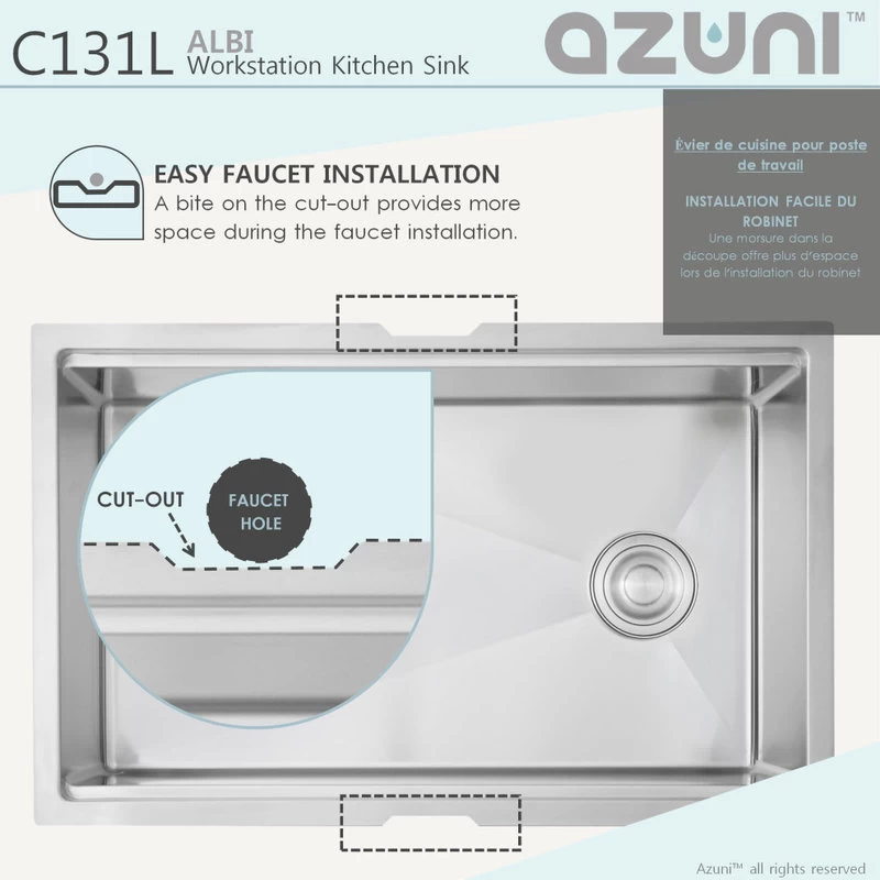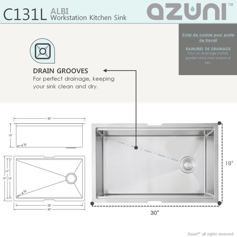 This undermount kitchen sink has the drain towards the side for the best utilization of the space under the sink cabinet and centered allowing you install the sink with the drain to the left or to the right. Also, the stainless-steel kitchen sink basin has drain grooves for optimal drainage. This handmade stainless-steel sink combines functionality, quality, and affordability. The tight 10mm radius corners are perfectly blended through an automated machine buffing system, and careful hand polished, for a luxurious finish. This undermount kitchen sink is equipped with top-level soundproofing, including thick rubber dampening pads. Each sink is additionally treated with protective coating, which reduces condensation and further dampens sound. The corrosion-resistant surface is further protected from rust and oxidation by a meticulous finishing process. Commercial-grade satin finish and gently rounded corners make maintenance as simple as wiping the surface with a damp cloth. For easy installation, all mounting hardware is provided. Our sinks are Canadian designed and meet the highest plumbing standards of North America. AZUNI sinks are trusted by architects and builders for upscale projects and modern makeovers.