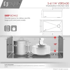 Stylish® handmade stainless steel sinks combine functionality, quality and affordability. Made of surgical grade SUS 304 stainless steel in 16 Gauge, with an optimized 18pct Chromium and 10pct Nickel content to provide excellent strength and hardness. The specially chosen satin finish will hide water spots and maintain a uniform patina finish as the sink ages. The extra-deep basin accommodates pots and pans easily, but it also hides dirty dishes in the sink basin and under the countertop line. The tight-10mm radius corners are perfectly blended through an automated machine buffing system and careful hand polished, for a luxurious finish. This sink comes with one bottom grid, bamboo cutting board, drying rack and colander.