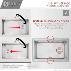 - With this reversible sink you can flip the sink around to have the drain on either the right or the left, whatever is convenient for your plumbing