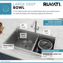 - INTERIOR BOWL DIMENSIONS: 18″ x 16″ (left) , 12″ x 16″ (right) x 10″ (bowl depth)
