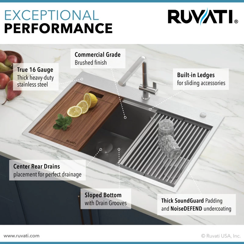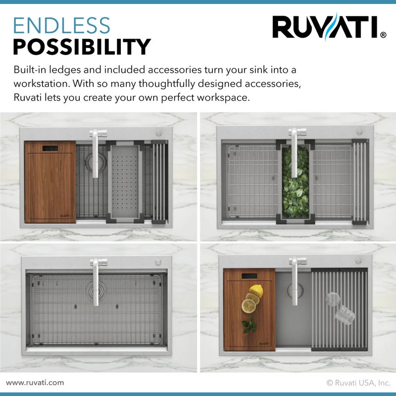 Sleek and stylish — the Siena collection from Ruvati combines a solid topmount rim with a functional workstation. Featuring sinks of all sizes, each is accompanied by a variety of accessories. From Ruvati’s innovative foldable drying rack® to the classic cutting board and colander combination, everything you need is right where you need it. With a 1-inch wide and 1/4-inch high rim that sits on the countertop, you can do all your prep work right on top of your sink and keep your kitchen or bar free of mess. With the Siena collection, you can do so much more with your space.
