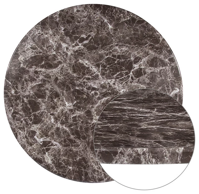 36″ Round Gray Marble PVC Table Top This classic round faux marble table top adds elegance and is the perfect way to add a fresh, unique look to your dining area. Select this table to feature an affluent, simple elegance or chic style appeal. Surface is heat, scratch and moisture resistant. Clean up is a breeze using a mild detergent and water. For a spotless finish, use a dry to cloth after cleaning. If you are looking to add this design detail to upgrade your hospitality space, this faux marble top is perfect for any environment.Product Dimension-35.75″W x 35.75″D x 1.5″H