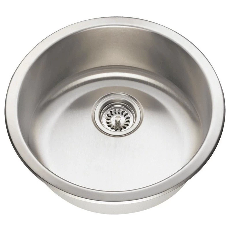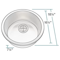This round, bar sink can be top or undermounted; and its durability and size makes it practical in locations beyond the entertainment area. In the kitchen, it acts as the ideal prep sink; or even the primary sink if space is limited. And if stainless steel fits the decor, it is a great option for the bath. This model is 304-grade, cold rolled steel, at the industry standard 18-gauge thickness or the thicker 16-gauge stainless steel. The surface is given a brushed-satin finish which adds to its luster and masks minor scratches which could occur over time. Dense, sound-dampening pads and an insulation coating are applied to its underside. With an overall measurement of 18 1/4″ x 18 1/4″ x 7 1/4″, it will require a minimum-width cabinet of 21″. It is cUPC certified. This listing does not include any accessories.