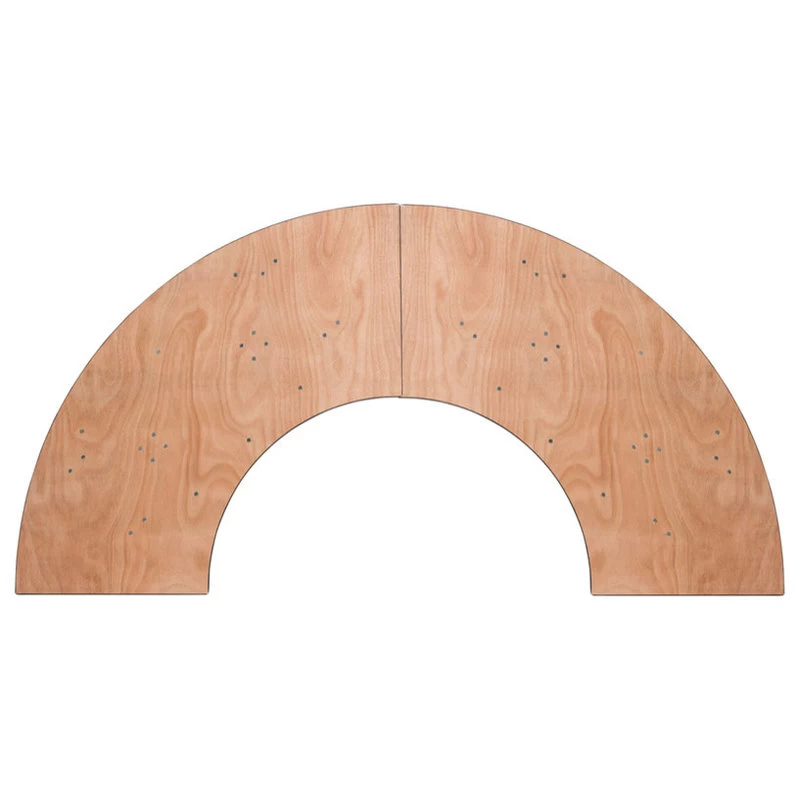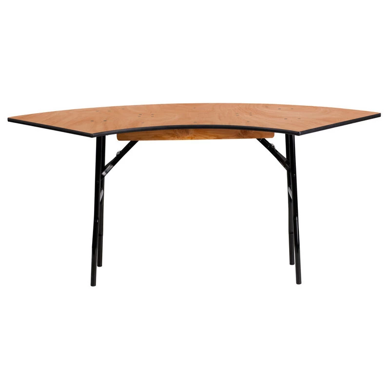This semi-circular wood folding table allows you to create a serpentine, half circle or full circle table. The serpentine table allows you to create beautiful arrangements for weddings, banquets and other events. Create a serpentine table by placing two tables in alternate directions. Create a half circle or full circle by placing two or four tables together from end-to-end. The table legs fold under the table to make storage more convenient and for better portability. This table is commercial grade to withstand everyday use in the hospitality industry.