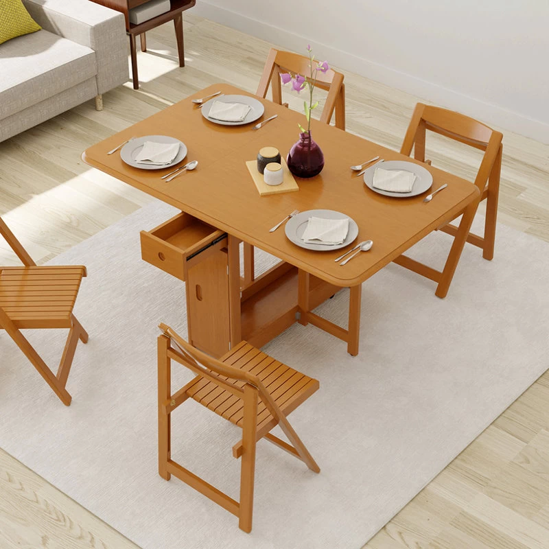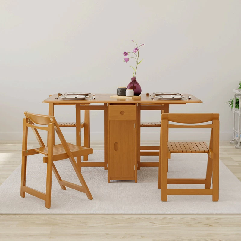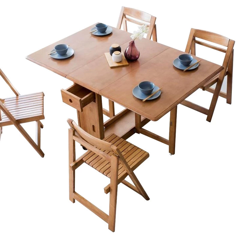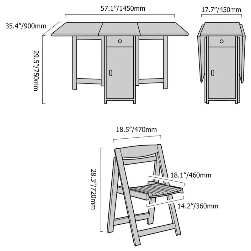 Featuring understated silhouette with clean lines, this counter-height dining table brings contemporary flair to your home. The characteristic of this multifunctional dining table is the folding design which can be extended unilaterally or bilaterally. When it’s not in use, you can fold down the sides and use as a console table with drawer storage. Four folding chairs are included while you can stow them underneath the countertop, space-saving and ingenious. Four-wheel design allows the folded set to be easily transported out of the way for storage. Versatile, casual and compact with decent style, this multifunctional dining table is perfect for a small dining area or cozy nook.