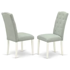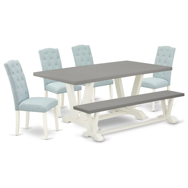 East West Furniture 6-Piece Dining Room Table Set- 4 Parson Dining Chairs with Baby Blue Linen Fabric Seat and Button Tufted Chair Back – Rectangular Top & Wooden Legs Dining Table and Wooden Bench – Cement and Linen White FinishEAST WEST FURNITURE 6-PC DINETTE SET- 4 STUNNING PADDED PARSON CHAIR, 1 DINING ROOM TABLE AND SMALL BENCH