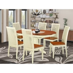 KEIP7-BMK-W 7-Piece dinette set with one Kenley table and 6 dining room chairs in a Buttermilk & Cherry FinishThis particular oval kitchen dining table set can contribute that special impression for dining room elegance to both traditional and fashionable decorating. Give your room decor a new and polished look with this modern 7 Piece Dining Set. Available in a marvelous Buttermilk & Cherry finish, you can easily incorporate this set into virtually any setting. Made from solid rubberwood, this charming set includes a clean-lined round-oval table with a single solid pedestal base, and six traditional styled side chairs with sturdy wood seats. Maximum support and stability is offered by the pedestal styled base of this 7-piece dining set. It can be cleaned with a damp cloth.