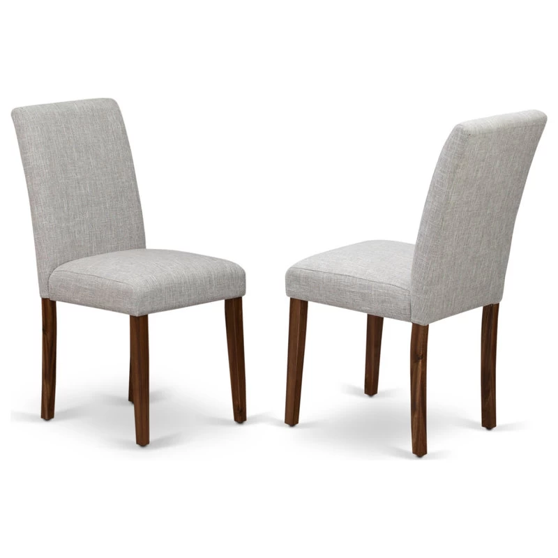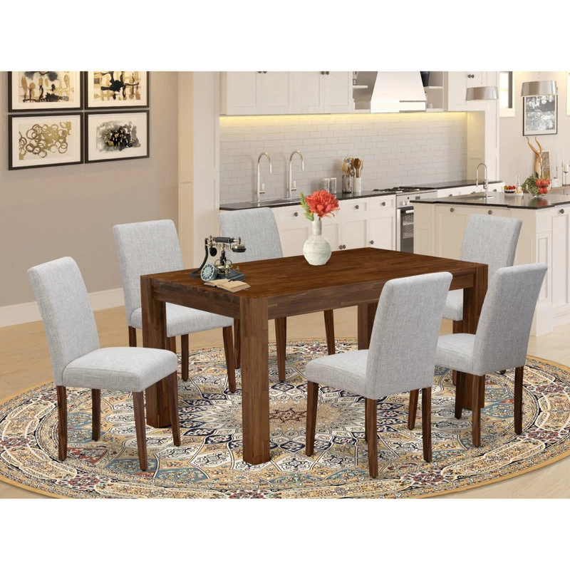 East West Furniture CNAB7-NN-35 7Pc Wood Dining Table Set Consists of a Wood Table and 6 Parsons Dining Room Chairs with Doeskin Color Linen Fabric, Medium Size Table with Full Back Chairs, Sand Blasting Antique Walnut FinishCNAB7-NN-35 East West Furniture CNAB7-NN-35 7Pc Wood Dining Table Set Consists of a Wood Table and 6 Parsons Dining Room Chairs with Doeskin Color Linen Fabric, Medium Size Table with Full Back Chairs, Sand Blasting Antique Walnut Finish, Introducing East West furniture’s�innovative�Celina�furniture�set�which can�transform�your house into a home. This�special�and�cutting edge�dining�set�consists of�a�dinette�table combined with�Upholstered Dining Chairs. Impressive wood texture with Sand Blasting Antique Walnut color and the�rectangular�shape design�specifies�the�sturdiness�and�longevity�of the�kitchen�table. The�perfect�dimensions of this�kitchen�table set made it quite simple to carry, clean, assemble and modify its places.�Produced�from Asian tropical hardwood�also known�as rubberwood, the�kitchen�table can be assembled without any extra tools and made to last for a long.The simple but charming Parsons chairs will add ambiance and style to any dining room. A contemporary twist on a classic design, this eye-catching design will liven up any look. The traditional parson gives this chair a touch of familiar charm, while the Doeskin fabric color seat with Sand Blasting Antique Walnut frame finish and clean-lined design elevate this chair with a modern flair. Plush padding covered with a soft fa bric seat offers comfort and the standard height back provides support for relaxing seating and thus reduce the chances of back pain. The sturdy construction of the hardwood frame and legs give this parson chairs stability and durability. Ready to give your dining room a new look? Just by switching out your chairs, you can effortlessly refresh your space. Try surrounding a sleek wood table in your dining room with these sleek chairs to craft a new aesthetic. This contemporary, budget friendly, durable and comfortable dining set furniture can be good choice if you are looking for a great dining time experience with family and friends.