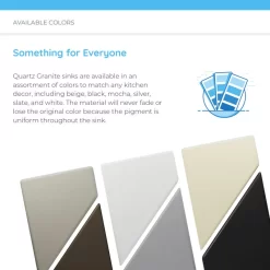 The 805-White sink has numerous exciting features; not the least of which is its Granite composition. A balance of 80% quartz 20% acrylic, makes for a very dense, nearly impervious substance with a very attractive, satiny-smooth appearance. It is nearly impossible to scratch or stain because of its density and it can withstand extreme temperatures – a dropped knife will not scratch, acidic foods will not stain and hot pots will not burn the surface. No sound-dampening pads are required because Granite is inherently quiet. The 805-White model is a smaller-sized sink, offering a nearly square, single-bowl design of modest depth; making it a perfect fit for kitchens with limited space. With an overall measurement of 17-3/4 in. x 16-7/8 in. x 7-3/4 in., it will require a minimum-width cabinet of 18 in. It is cUPC certified. 1 white strainer, designed to match the finish of this sink, is included. It not only provides a perfect complement to the sink, but it will catch unwanted waste.