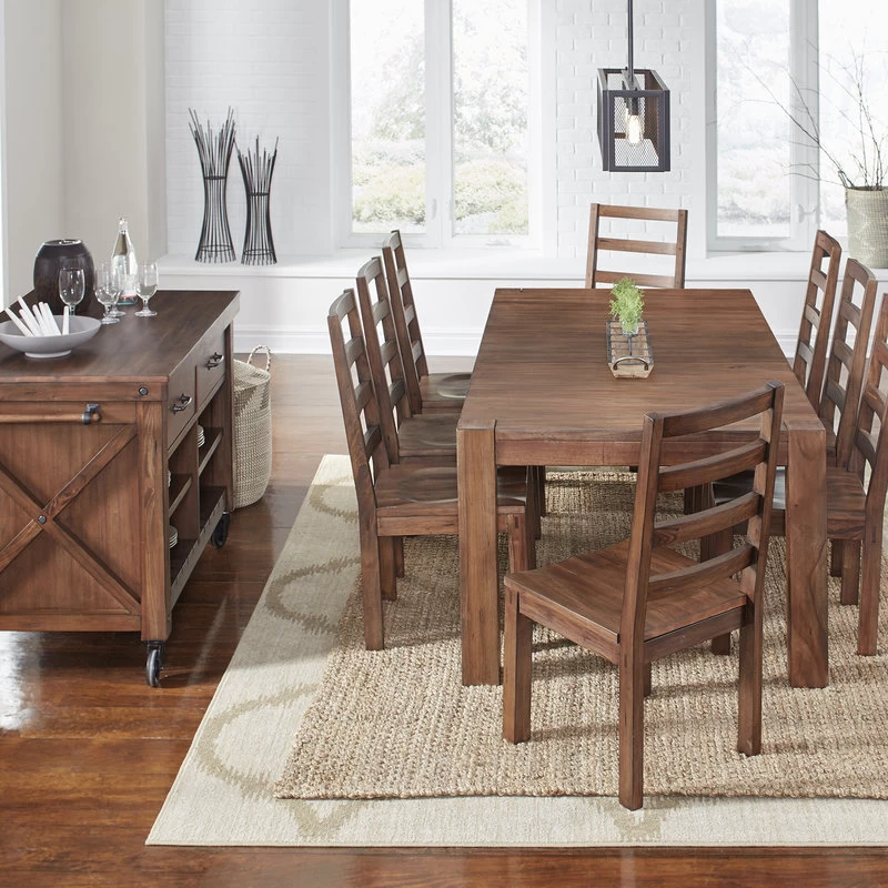 The Anacortes Dining Collection is crafted from plantation grown Solid Mahogany. This hardwood is the perfect choice for the vintage industrial motif of this collection due to its durability and exotic look. The 9-Step Salvage Mahogany finish lends a gingered patina that resembles reclaimed wood, while the wire brushing offers a soft hand that imparts an aged quality. Generous hand-applied distressing tecniques, metal accents, and bronze finished hardware complete the look. This collection offers three different dining table options: an Oval Pedestal Table that converts to a 46″ Round Table, a 90″ Leg Table, and a 105″ Trestle Table. There are muliple seating options and a beautiful Kitchen Island with Casters and 64″ Server to complete the collection.