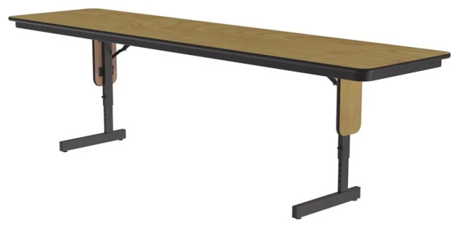 Panel Leg Adjustable Height Folding Seminar Table. Folding mechanism attached to back leaving underneath table open for user’s leg room. Side Panels give table a finished, dressy look. Made in USA.