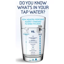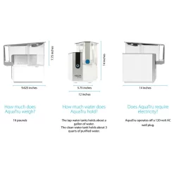 Certified to remove 83 toxic chemicals including lead, chromium 6, chlorine, fluoride, pesticides, fertilizers, POFA, PFOS and more! With AquaTru, you can transform your tap water into pure, delicious water you can trust. Affordable long lasting filters. Certified to NSF standards by IAMPO to remove 15x more contaminants than the leading pitcher filters. BPA free clean water tank. Digital display. Change filter notification. Easy to push dispensing button. Perfect to take camping, RV and vacation home. Completely portable. Pre-Filter to be replaced every 6 months; Reverse Osmosis Filter to be replaced every 24 months; VOC filter to be replaced every 12 months. Dimensions Width = 12; Depth = 15; Height = 14