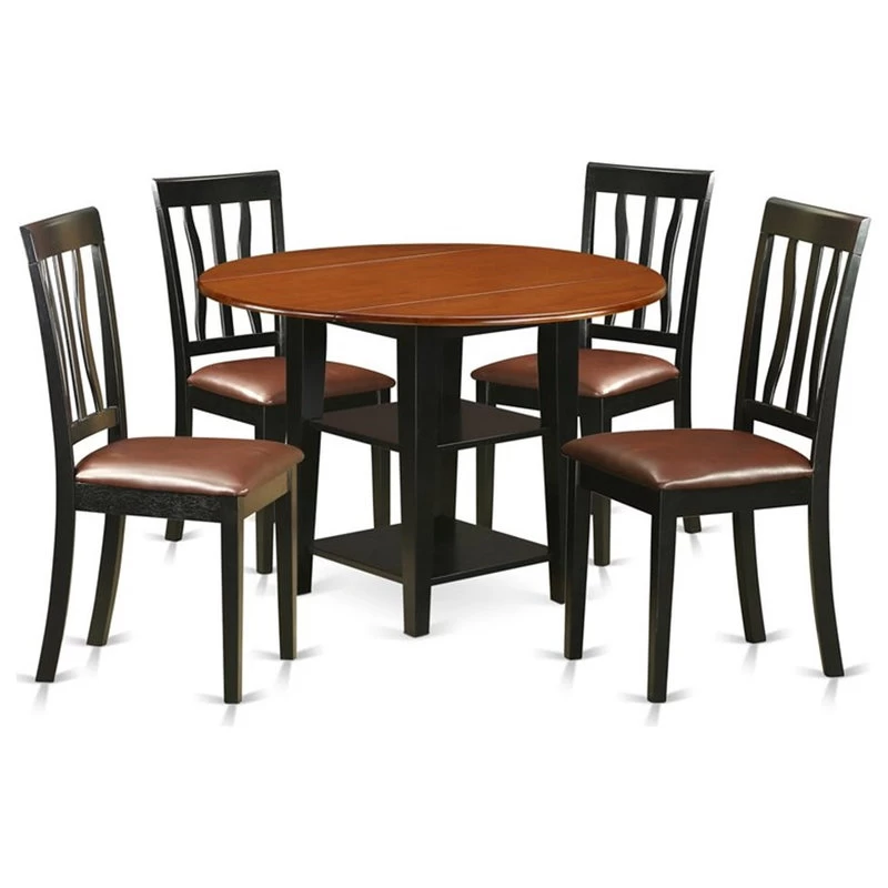 Renovate your breakfast nook or bring traditional charm back into the dining room with this must-have five-piece dining set. Founded atop 4 solid table legs, its table features a round silhouette with two state-of-the-art drop leaves. Surrounding this center table are 4 matching side chairs, each featuring turned legs and a curved slatted back. All finished in complementing Black & Cherry tones for a versatile look that works in a variety of aesthetics.