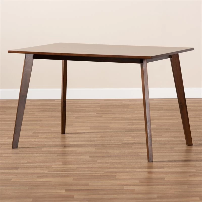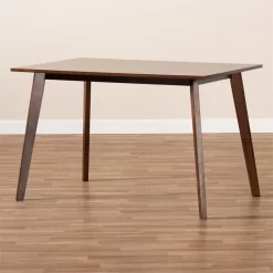 A simple, streamlined design makes the Britte dining table an easy addition to any dining space. Made in Malaysia, the Britte is constructed from durable rubberwood and comfortably seats up to four. A walnut brown finish and rectangular tabletop lend modern style while providing ample elbow room to each member of the table. The Britte requires assembly and is supported by splayed legs that add a dose of mid-century appeal. Featuring a compact size, the Britte dining table is well suited for smaller nooks and dining rooms. Dimensions: 29.50″ High x 47.20″ Wide x 29.50″ Deep; Legs: 28.80″ High
