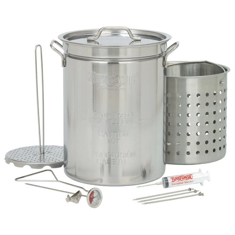 *(3) Chicken Skewer Set, Fryer Pot, Basket, Vented Lid, Stainless Steel Perforated Poultry Rack and Grab Hook, Thermometer and Trail Seasoning Injector.