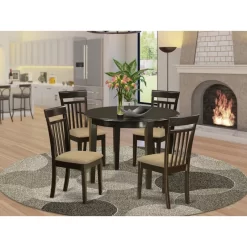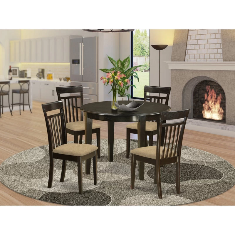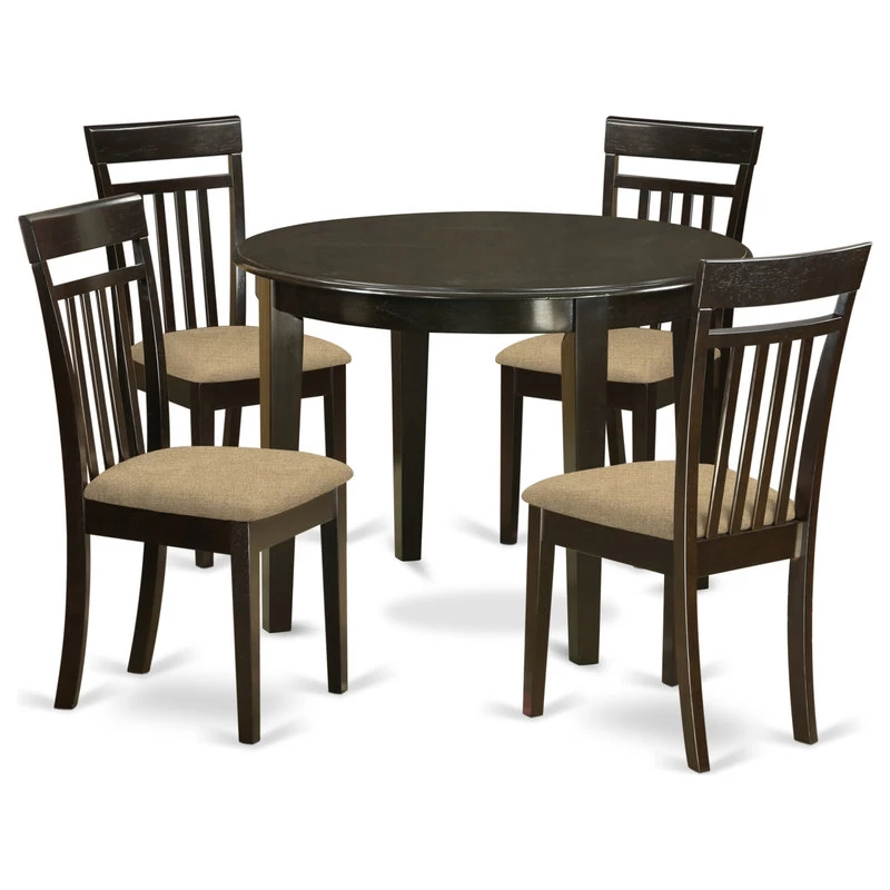 BOCA5-CAP-C 5 Pc small Kitchen Table and Chairs set-round Kitchen Table and 4 Dining Chairs This specific dark wood dining table features a sleek finish coupled with Complementing dinette chairs, which make it an impressive addition for each and every dining room. The dining table is 42″ width, exceptional for your household not to mention guests alike. There are four sleek durable legs to match the round small kitchen table top, that will feature a height of 30″. Our own exquisite fashioned dining chairs have the sophisticated slat back design. The dining room chairs hypnotize you with its simple charm. This dining room set is constructed of the very best quality Asian hardwood and provide you many years of memories while your relatives and buddies get together about the dining tables.