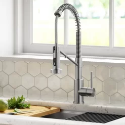 COMMERCIAL PULL-DOWN DESIGN creates a professional look with an industrial open-coil spout and offers the convenience of a pull-down sprayhead with extended range of motion
