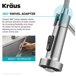 REACH TECHNOLOGY with easy-retract hose and swivel adapter offers maximum sprayhead maneuverability with the ability to flex, pivot, and reach all around the sink