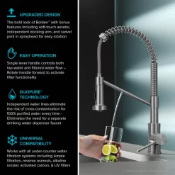 The Bolden Water Filter Faucet combines the benefits of an industrial-style pull down faucet with the added convenience of an integrated drinking water filter tap. The 2-in-1 design eliminates the need for a separate water purifier system or a bulky faucet-mounted filter, streamlining the look and functionality of your kitchen. Engineered with DuoPure Technology, this innovative kitchen faucet features two independent lines for regular and filtered water, preventing the possibility of cross-contamination and ensuring 100-percent purified water every time. The universal 2-in-1 design connects to your choice of undercounter water filtration system, including Reverse Osmosis, for easy access to filtered water for drinking, cooking, and filling water bottles. A single lever handle controls the flow of both tap and filtered water; simply rotate the handle all the way forward to activate the filter function. Optimized for residential use, Bolden creates a captivating industrial look with a high-arc open coil spout, and offers the advantage of compact height that fits where other commercial-style faucets can’t. A pull-down sprayer with swivel adapter provides superior maneuverability and an extended range of motion, allowing you to reach all around the kitchen sink. The dual-function sprayhead switches from aerated stream to powerful spray to rinse away stubborn residue. Heavy-duty construction and premium components ensure long-lasting leak-free use. For easy installation, Bolden comes with pre-attached water lines and all mounting hardware included
