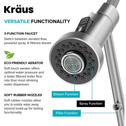 3-FUNCTION FAUCET: Switch between aerated stream for everyday cleaning, powerful spray for heavy-duty rinsing, or dispense filtered water right from your kitchen faucet