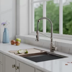 The centerpiece of your dream kitchen has arrived with Bolden. Available in five finishes, the Bolden commercial kitchen faucet is designed to transform any kitchen into a high-end culinary workspace. The industrial pull-down faucet is configured at a compact 18 inch height to fit under most cabinets. A retractable 20 inch hose provides superior maneuverability, and the dual-function sprayhead gives users the ability to switch from splash-free aerated stream to powerful spray in a snap.