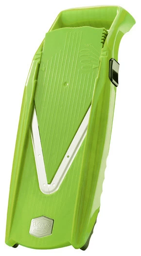 Quickly cut fresh ingredients for your favorite recipes with the Borner VPower mandoline. With a tough ABS plastic frame in green and surgical grade stainless steel blades, this tool makes short work of preparing tomatoes, carrots, onions, and more. Three inserts allow you to julienne, shred, cube, and make perfect French fries, each in four different thicknesses. A food safety holder keeps fingers away from the razor-sharp blades, and adjusting the thickness of your cut is as simple as pushing a button, so there’s no need to remove the insert. Its slip-resistant rubber feet ensure stability, and an insert storage holder doubles as a drying rack.