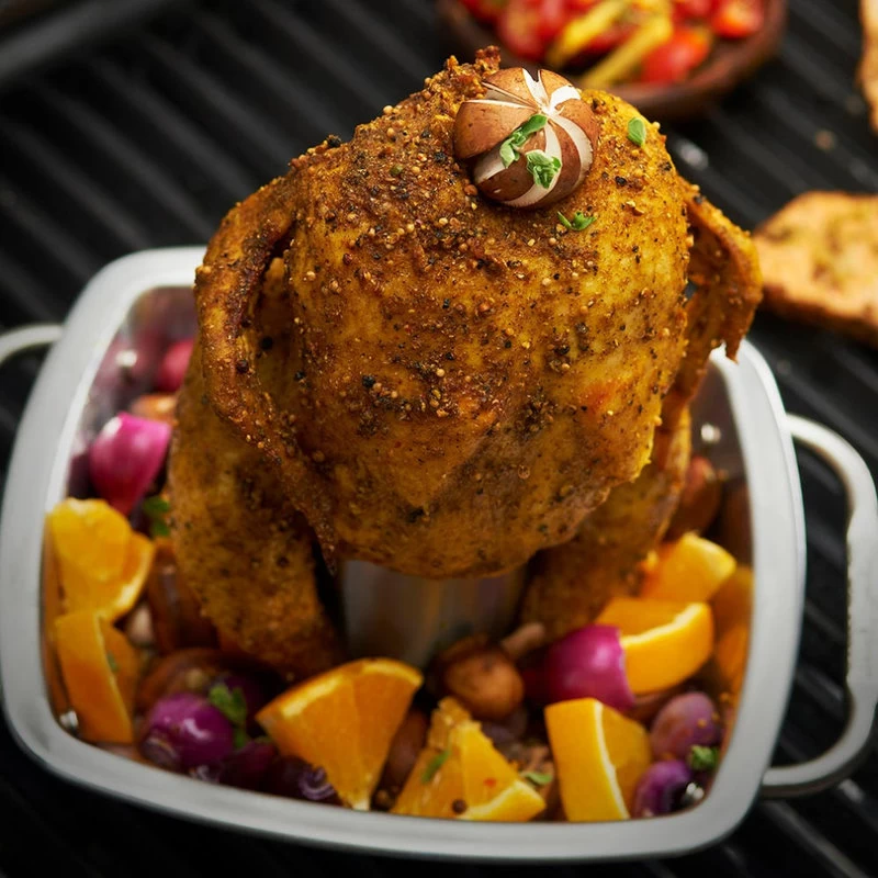 The Stainless Steel Chicken Roaster With Pan offers a premium accessory for use with your grill. The Broil King Imperial chicken roaster is crafted entirely of stainless steel with heavy 9- by 9-inch base and oversized 10mm handles for proven durability. The twist on the beer can holder has a large enough capacity to replace the beer can entirely and is vented at the top for better steaming action to help you get even more use out of your grill.