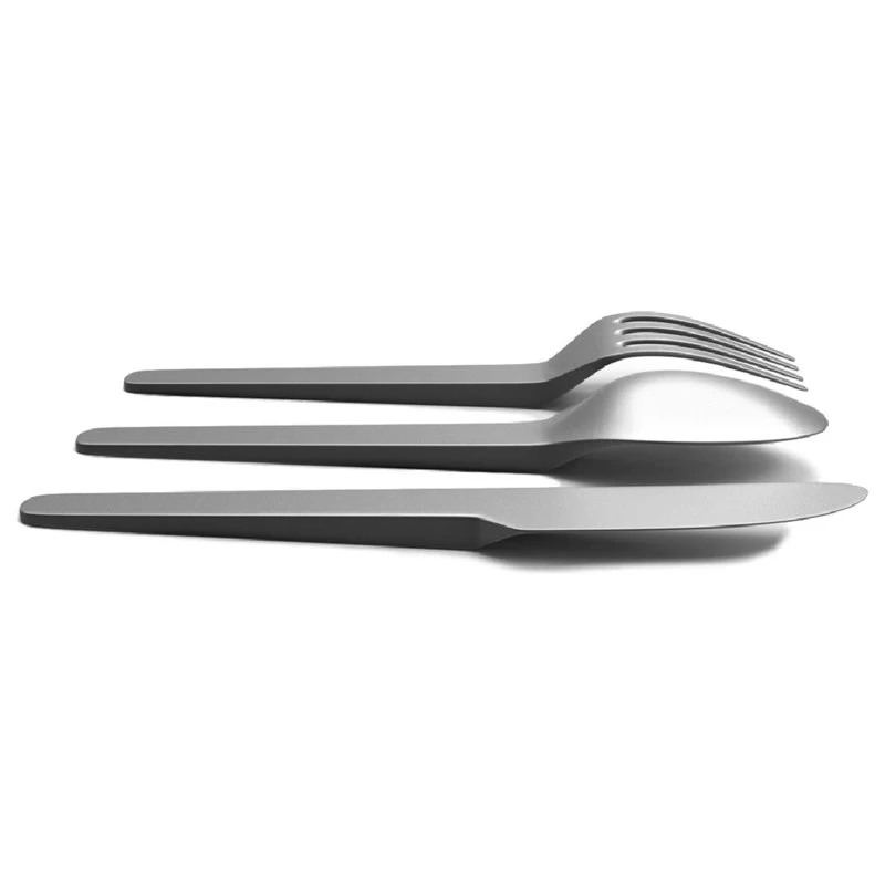 Cantilever Flatware is sold in sets with three pieces: fork, knife, and spoon.