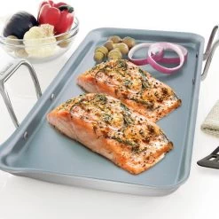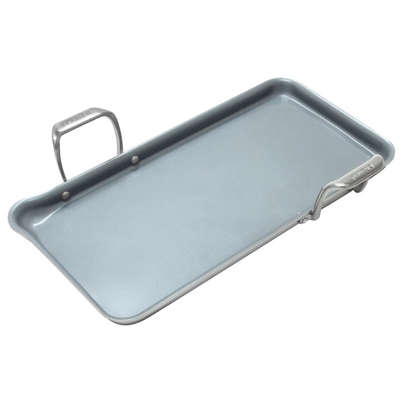 Make a batch of pancakes for breakfast with this tri-ply griddle from Chantal’s Induction 21 collection. Made from heavy gauge steel, it features PTFE, PFOA, lead,and cadmium-free ceramic coating. It fits on most sync burner cooktops and has convenient offset handles and an easy-to-use pouring spout. This pan provides even heat distribution and is suitable for all cooktops, including induction.