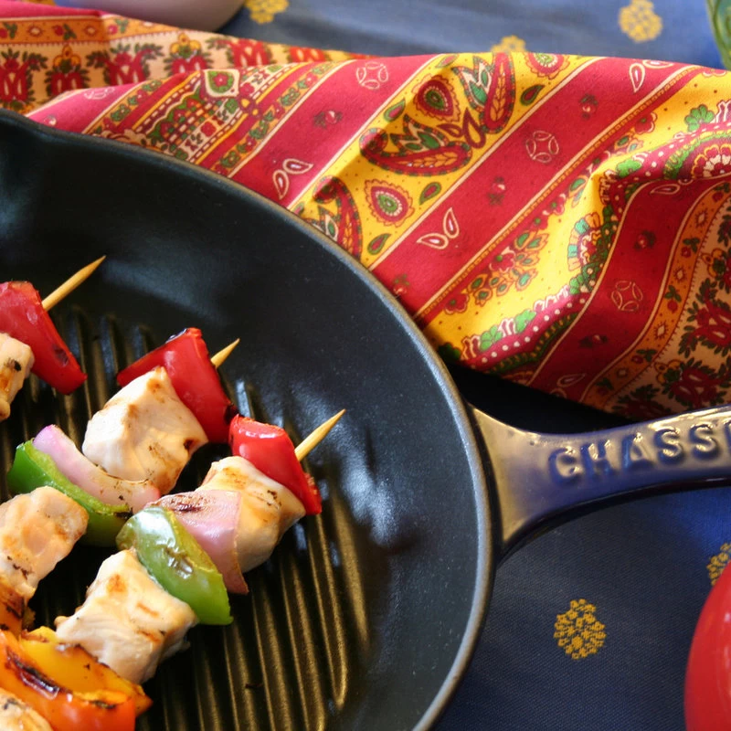 The Chasseur Round Cast Iron Grill provides all the flavor of an outdoor grill, with all the convenience of indoor cooking. This grill pan is constructed of thick cast iron to maintain its temperature during cooking, making it ideal for grilling anytime.While cooking, ridges allow excess fat and grease to drain, and the spouts on the edge allow for easy removal. The extra handles makes this fry pan easy to move and perfect for any kitchen.