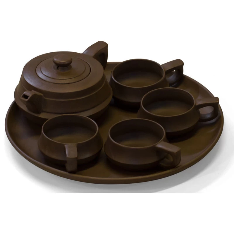 This beautiful tea set is made in Yixing, one of the famous pottery capitals of China. Yixing teawares are prized for their unglazed finish. Leaving the teapot unglazed allows it to absorb traces of the beverage, creating a more complex flavor. This beautiful tea set comes with four cups and a serving plate in a deep unglazed earthy brown finish. It is a must have for any tea connoisseur. This item will be shipped from Westmont, IL 60559 U.S.A