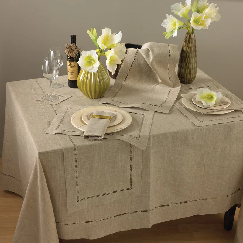 Classic Hemstitched Linen Blend Tablecloth, Natural, 65″x104″ Oblong