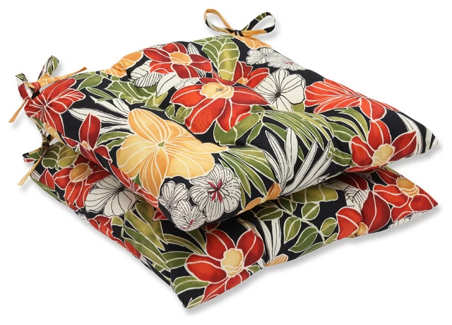 The colors and flowers of Hawaii wonderfully blend together with this spirited style addition. Set against a black background, green, red and maize bounce beautifully to create a robust pattern. Simply pair this set of two seat cushions with your decor for an inspired look.