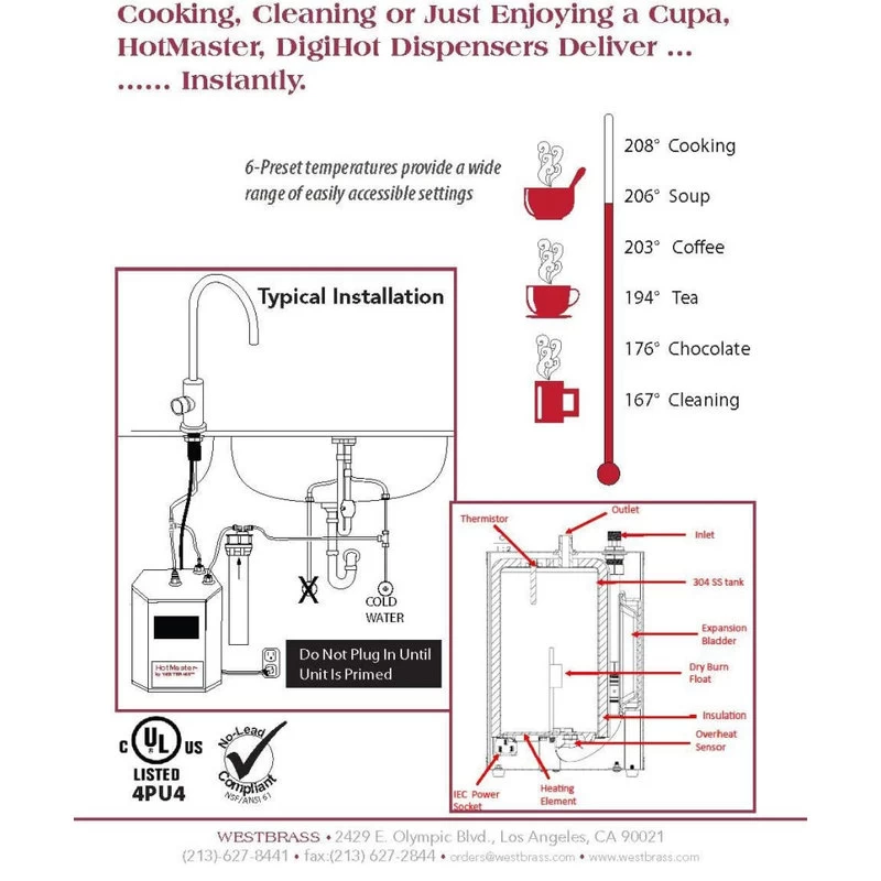 HotMaster Digihot tank dispenses instant hot water for food, beverage and cleansing operations. The dispenser instantly provides water at the 6 preset temperatures selected during installation. The unit’s fixed spout design, mounted with its spring back handle behind the faucet, provides extra safety and security during operation. Digihot faucets, are ideal for kitchens or bars; or any location requiring a source of constant, fast, hot water. Water reheats using a superfast 1500 Watt element, which is separated from the water by a stainless steel plate to prevent element corrosion. The tank is laser welded, 304 stainless steel for superior longevity. The dry-start float and the over-heat protector are also stainless steel to prevent off taste and odors caused by copper sulfate compounds. The non-pressurized bladder system prevents catastrophic tank failures. On/off control button is designed for vacation or down time. The easily controlled temperature settings range from 167 – 208 degrees F.