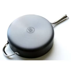 Cooks Standard Hard Anodize Premium Grade Nonstick 5-QT/11-inch Deep Straight Sauté Pan with Cover, cover is tempered Glass lid, protected by stainless steel rim outside of glass and Ergonomically designed Stainless steel handle, riveted for strength, premium grade nonstick deliver exceptional performance, Heavy gauge aluminum core is super heat distribution without any ” Hot spot”.