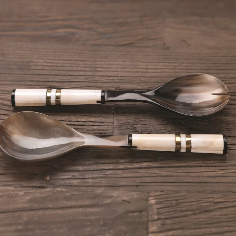 Beautifully crafted white bone salad severs with intricate bone and horn detailing. These handcrafted set of salad severs are an essential table top accessory for your home this summer season.