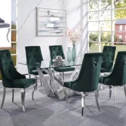 The Dekel dining set brings a modern twist to classic Hollywood glamor with glimmering glass and stainless steel. The unique angles of the dining table’s metal base contrasts beautifully with the soft upholstery of the side chairs, which feature seat backs with button-tufting and decorative metal rings. Vintage glam style is easy to achieve with the Dekel dining set.