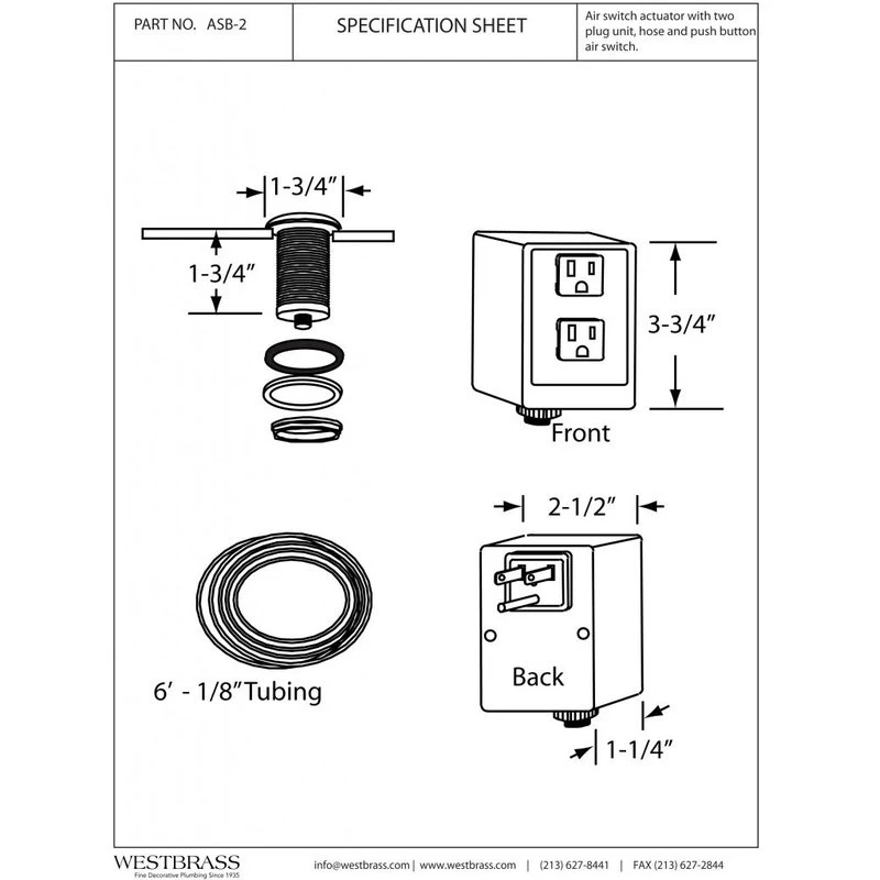 Install any brand disposal unit with this decorative flush mounted button from Westbrass. Sturdily constructed button, securely mounts to the switching unit with an air hose. A pulse of air starts the disposal running while shutting off the second outlet. A second pulse makes the disposal stop, and reactivates the second outlet. System is perfectly designed for instant hot and disposal packages. Available in a variety of finishes, this item is sure to complement your existing decorative fixtures while increasing disposal safety.