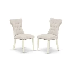 - These dining chairs have high stylish button tufted back with doeskin color linen fabric seat cover and fantastic wooden linen white color legs