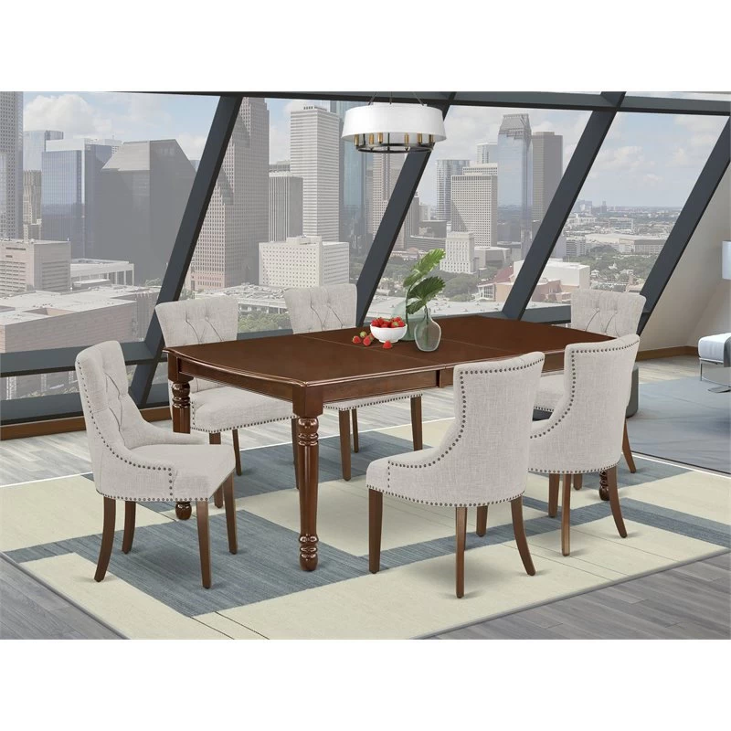 Quality is made attainable with this exclusive DOFR7-MAH-5 dinette set includes a rectangular dinette table and six parson chairs. The dining table can fit maximum of 8 people in the dining area. The table’s 4 straight leg support brings a simple and breezy style to any space, making it incredibly easy to incorporate into any dining room. The Kitchen table includes a built-in 18 inch self-storage expansion leaf which can be stored right beneath table the top. The wooden table is created from prime quality rubber wood known as Asian Hardwood. No heat treated pressured wood like MDF, particle board or veneer top fabricated. A regal and affordable Parson chair offers a touch of beauty to any dining room and provides a sensible seating arrangements. The upholstered dining chair features a beautiful stitched exterior. Standard back, Linen Fabric, Button tufted high-density foam padding, solid hardwood frame construction, comfortable, durable and attractive. Whether you use this kitchen chair is an easy to assemble and stylish answer to your seating needs. This budget friendly, durable and comfortable dinette set can be good choice if you are looking for a great dining time experience with your family or friends.