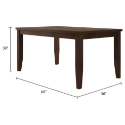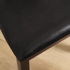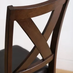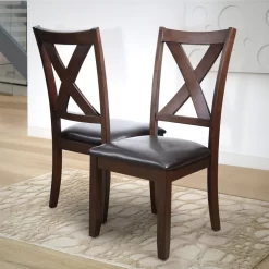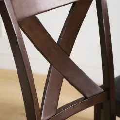 Welcome guests to the heart of your home during dinner parties with this seven-piece dining set. Crafted from a blend of solid and manufactured wood, it showcases a dark brown finish for a touch of traditional appeal. Its six side chairs boast black faux leather upholstery for an updated touch, while their open X-shape backs bring an interesting focal point to your ensemble.